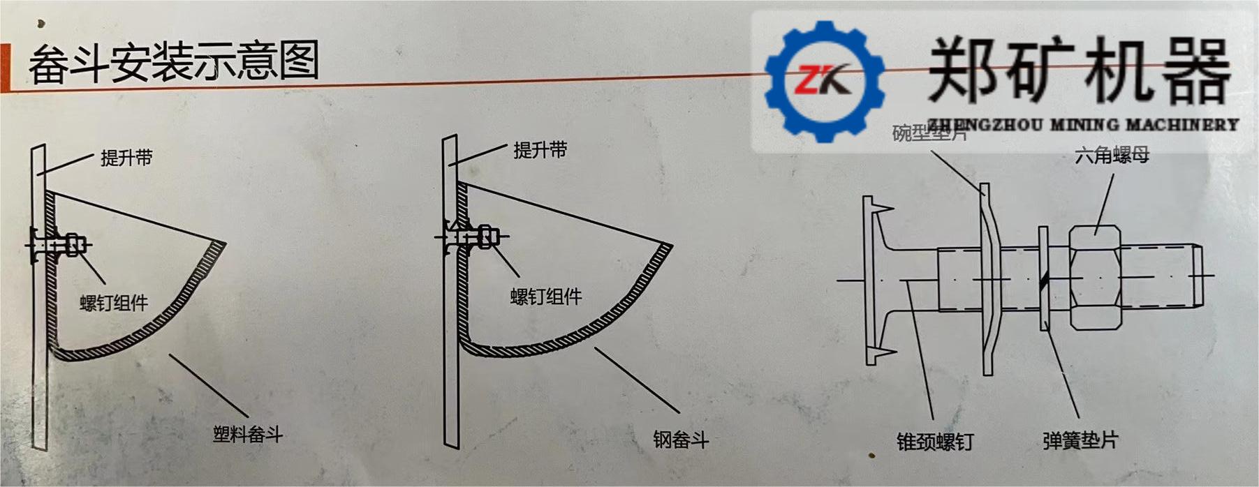 TD型膠帶式提升機(jī)采用膠帶作為料斗的牽引部件。料斗用具有特殊頭部的螺釘(牙口螺釘)固定在帶子上,為了使螺栓的頭部不妨礙膠帶通過(guò)滾筒,在料斗的后壁上制有相應(yīng)的凹槽。膠帶的寬度要根據(jù)膠帶的標(biāo)準(zhǔn)選取,帶寬應(yīng)比料斗的寬度在30-40mm。帶的帆布層數(shù)應(yīng)根據(jù)帶子所受的最大牽引力計(jì)算確定(通常不少于4層),計(jì)算方法同帶式輸送機(jī),但由于膠帶上鉆了連接料斗的孔,降低了膠帶的強(qiáng)度,所以應(yīng)比膠帶輸送機(jī)驗(yàn)算膠帶強(qiáng)度的安全系數(shù)增大10%左右。