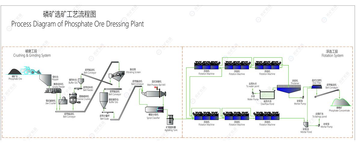 在對于磷元素的提取過程中,我們需要將大塊的磷礦石破碎、研磨成細(xì)粉,因此在選礦的過程中,就需要使用破碎機(jī)和球磨機(jī)這兩種類型的設(shè)備。研成粉末以后的磷礦由于磷礦石可浮性都比較高,還需要借助浮選機(jī)等進(jìn)行選別,由此可知:磷礦石選礦流程主要包括:破碎篩分、磨礦、浮選、脫水、尾礦處理幾個階段。不同階段處理流程不同,使用的設(shè)備也不同,下面就來對于這些階段進(jìn)行分析。1、破碎篩分階段:這一階段主要是將大塊的磷礦破碎成小塊,破碎的時候,需要采用二級閉路或三級閉路工藝將0-350毫米的大塊磷礦破碎至15毫米以下的小顆粒物料,然后才能進(jìn)行后續(xù)的粉磨作業(yè),這一階段的篩分作業(yè),主要是為了保證破碎后的磷礦石顆粒均勻且都符合15毫米以下的要求;